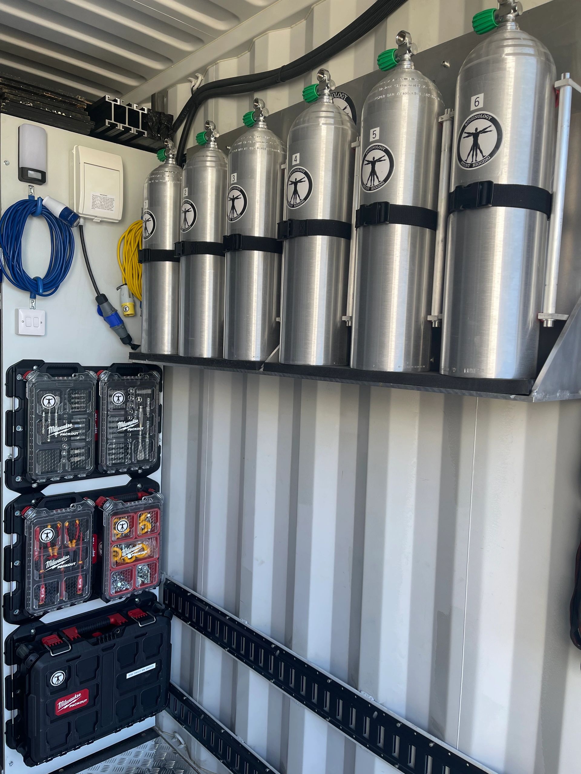 Rigginology can compress its own air for it's pneumatic firing packs, and charge its own batteries for its Harken winch lifting systems and power tools, through either solar (where permitted) or generated power.